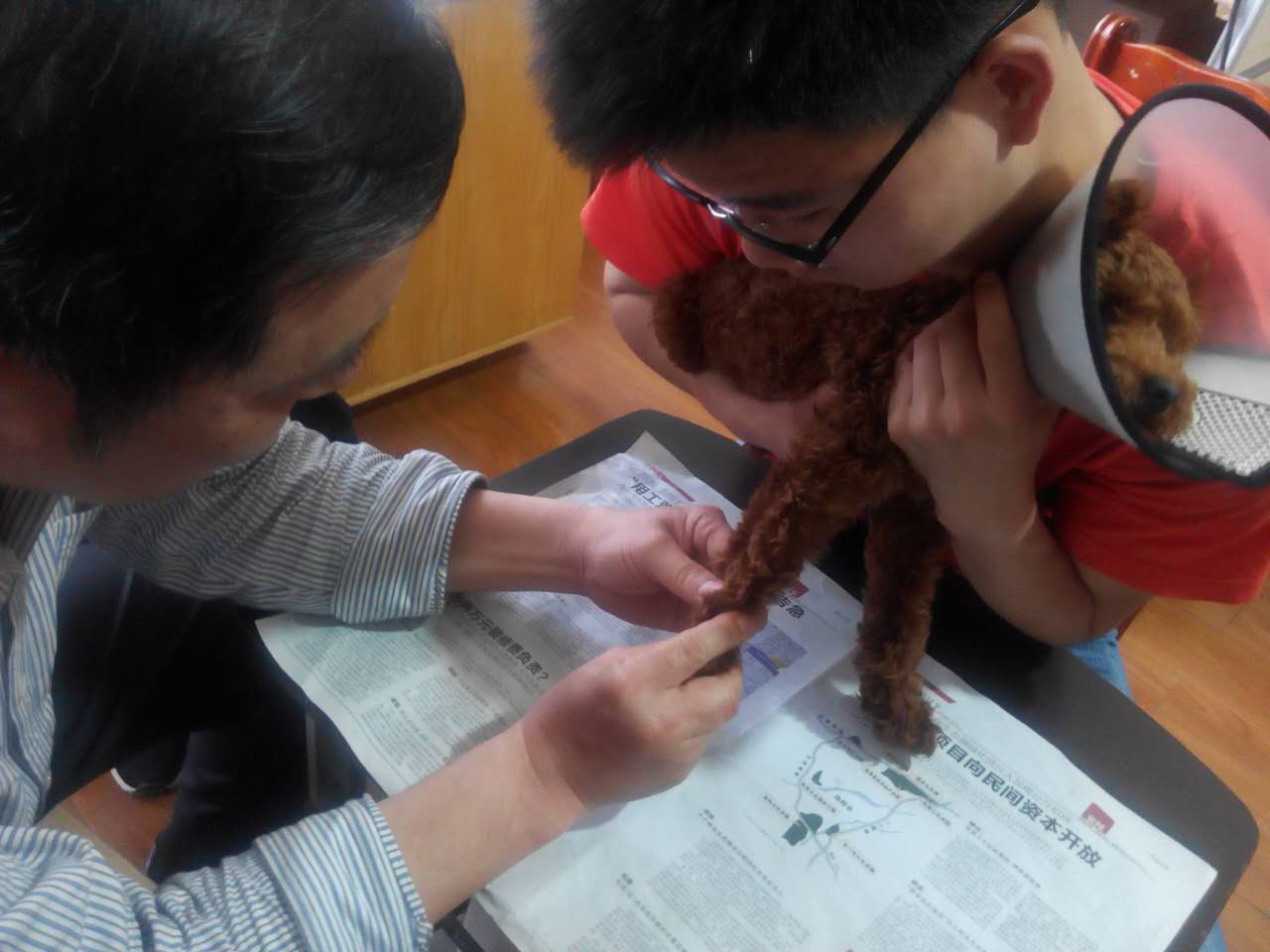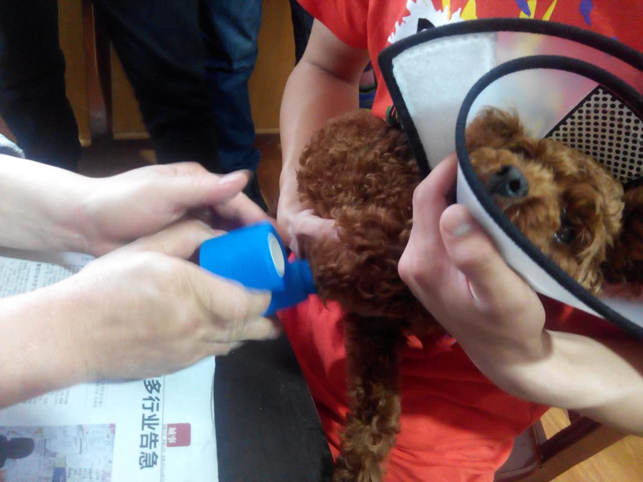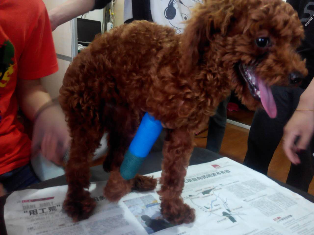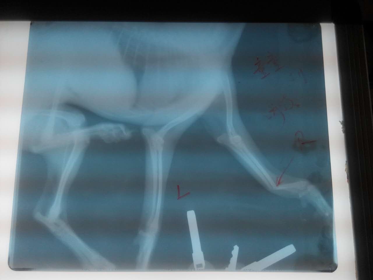 洛龍區元華國際,母泰迪犬童童從高處墜落己四天,X光片顯示右前肢前臂骨遠端完全骨折,且呈100度背角移位。