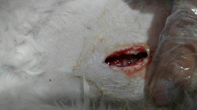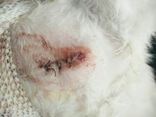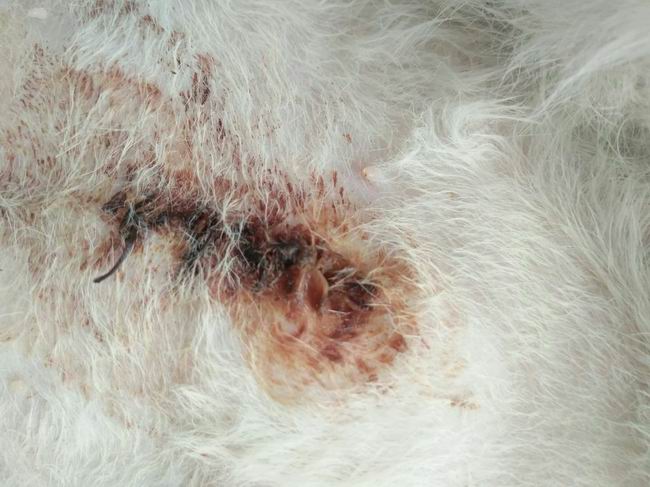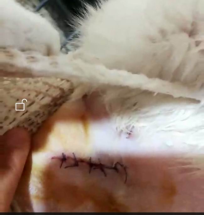 母貓絕育,小卡嘟,做完絕育在我院住院3天,我院醫護人員精心照顧,傷口恢復很快,后主人接回照顧,因傷口處理不當傷口滲出較多多為水樣液體,后經院長診斷為罕見的脂肪液化癥,經院長治療2次按院長推薦方法處理3天傷口已經干燥恢復良好。