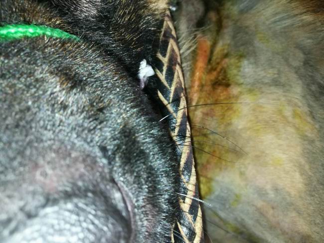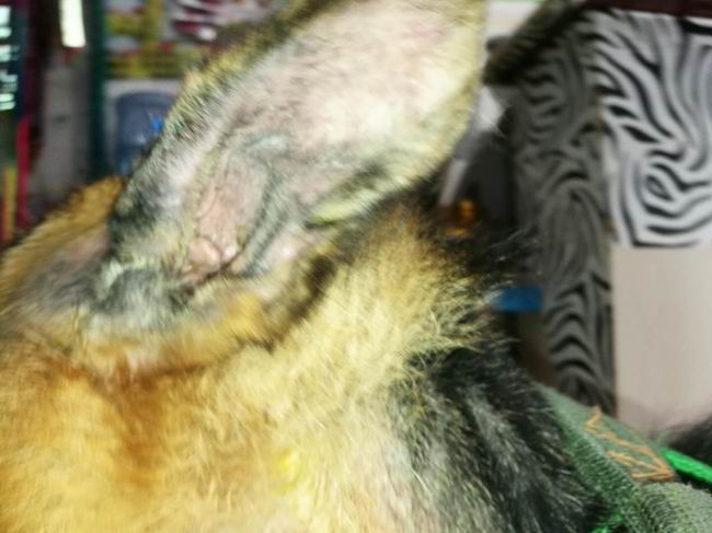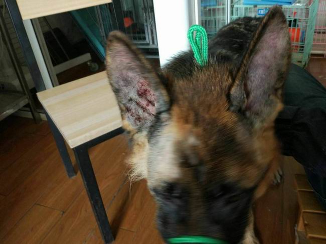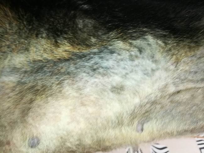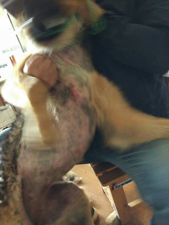 德國(guó)牧羊犬漢堡,因皮毛太厚主人在家洗澡又從未吹過,固發(fā)現(xiàn)有皮膚時(shí)已經(jīng)大面積脫毛發(fā)紅潰爛,耳朵內(nèi)潰爛,經(jīng)診斷屬于膿皮癥,經(jīng)過3次治療藥浴,漢堡皮膚病明顯改善不紅也多數(shù)結(jié)痂。