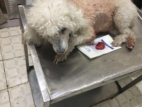 6歲貴賓犬左胸靠近心臟位置有一個(gè)5cm大小的肉瘤,主人咨詢(xún)其他寵物醫(yī)院后因接近心臟風(fēng)險(xiǎn)太大,無(wú)法進(jìn)行切除,來(lái)我院后經(jīng)過(guò)手術(shù)成功切除,且術(shù)后恢復(fù)良好。