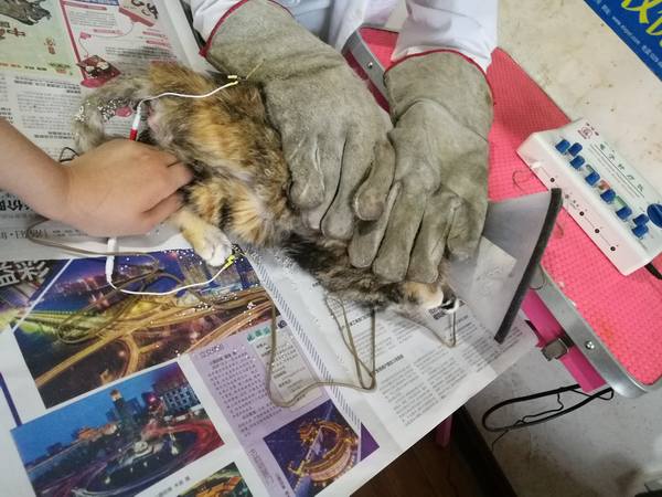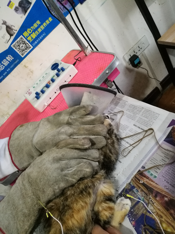 流浪貓小乖瘸腿右后腿遠端麻痹,尾巴麻痹,現針灸治療。