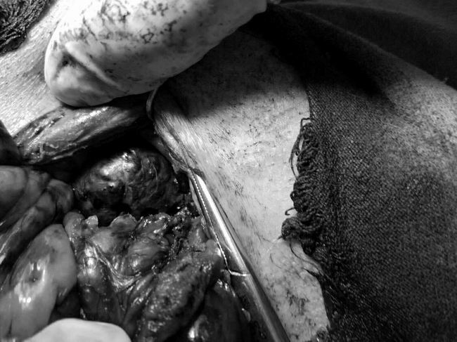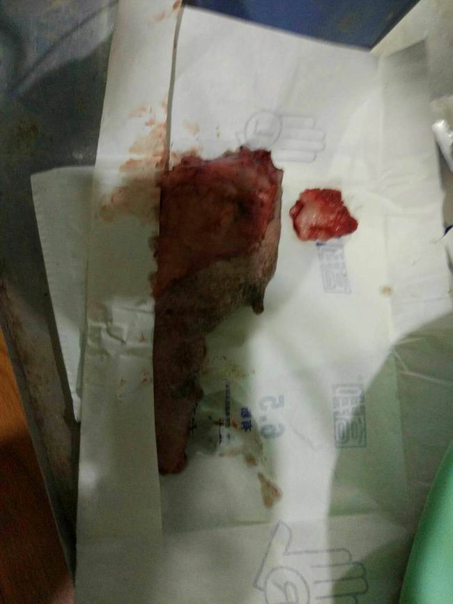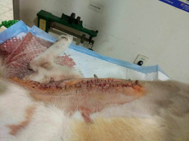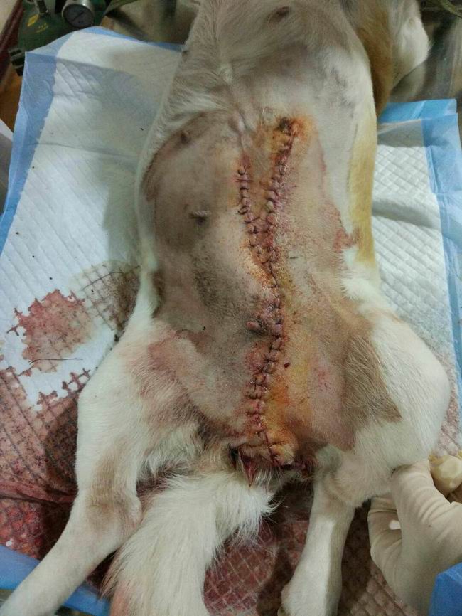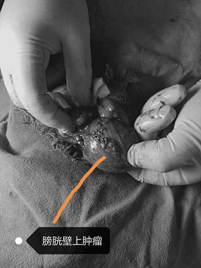花花,9歲,柯基串,經多處醫院診斷為卵巢腫瘤乳房腫瘤,乳房腫瘤長約20厘米寬約5厘米高約5厘米左右大瘤子,卵巢腫瘤約為成年人一個拳頭大小。因年紀體質腫瘤大手術風險大等原因,主人輾轉多處動物醫院咨詢,三思過后選擇我院進行手術。手術發現卵巢腫瘤已在腹腔擴散,膀胱壁已有多個小腫瘤。乳房腫瘤切下足足有1350克。