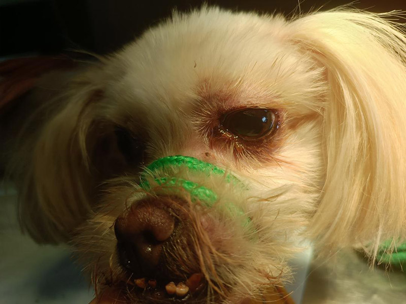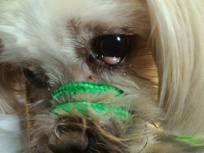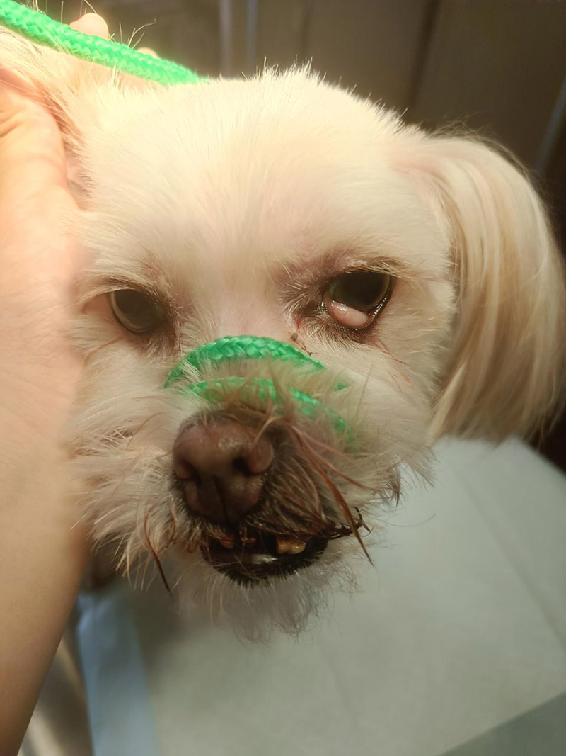 母犬,毛毛,8歲,約三月前左眼內角出現腫塊,曾用抗生素,未消退。